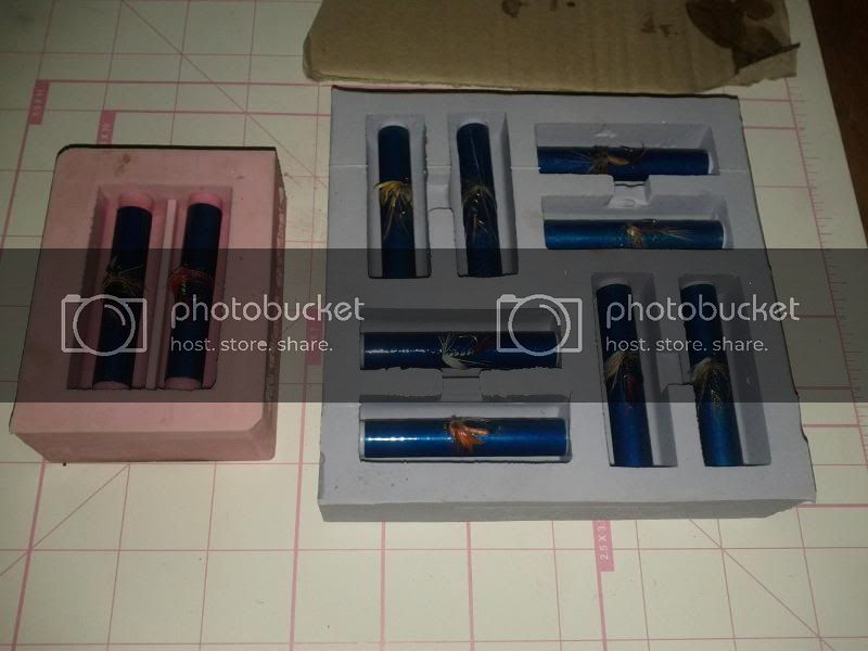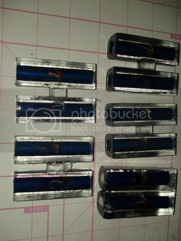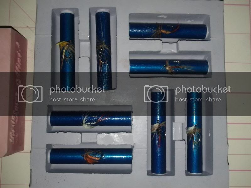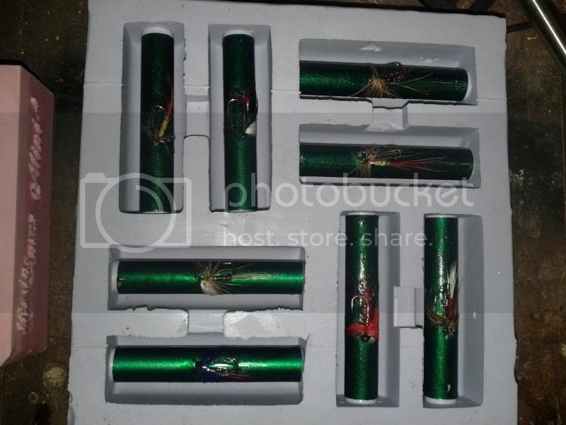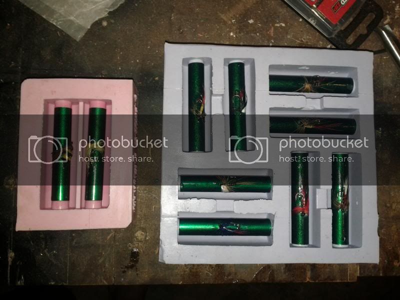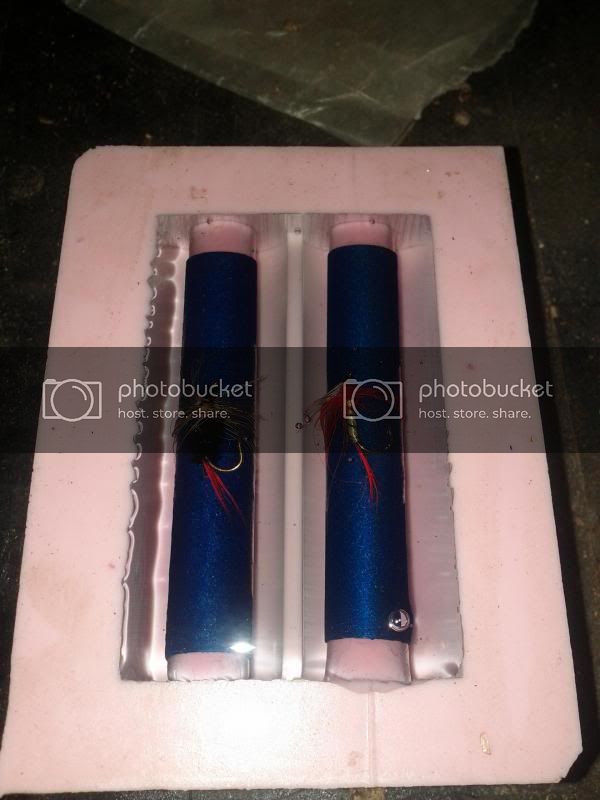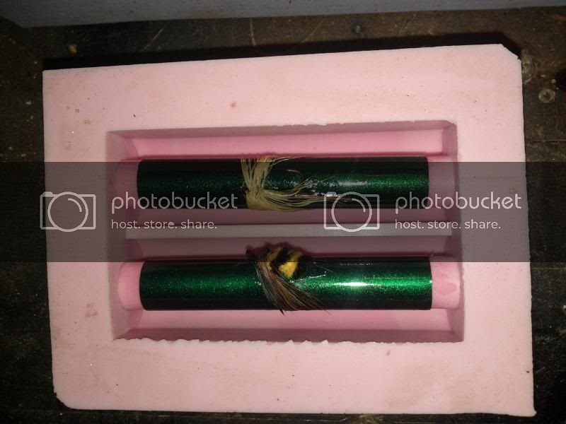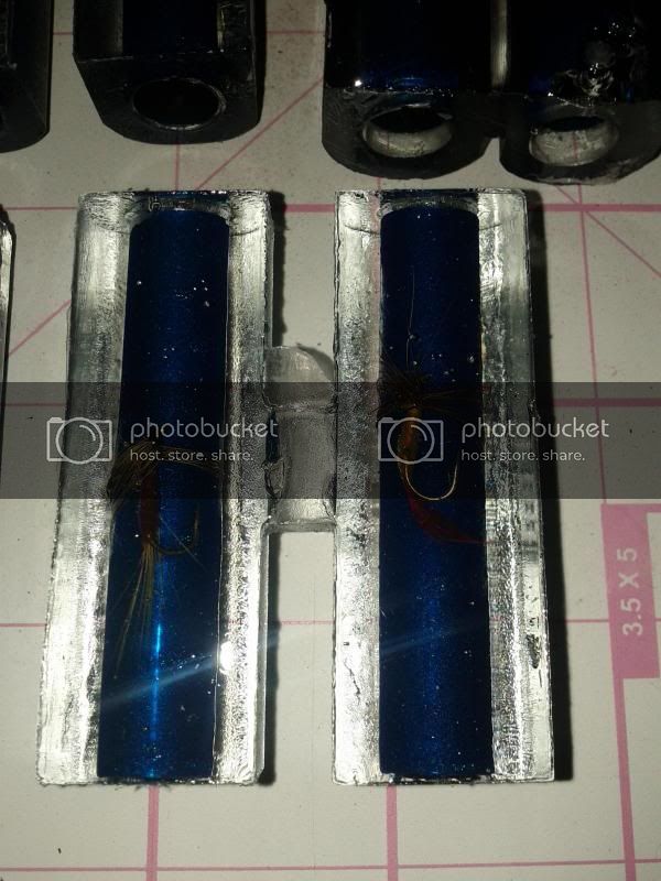 So I threw these together this weekend. Painted brass tubes with Testors metal flake body paint (model car paint stuff. wanted to get a bit of a shimmer in the background), pre-set the small, but sharp, fly fishing lures on tube Saturday morning. That evening, i finished by gluing the wings/feathers down around the tubes, then casted in 2 batches yesterday. They don't really photograph well because of the shiny surface, but when looking at them in person, the blues and greens look like ocean water (thought of calling the blue set "Caribbean" and the green set "Everglades". Maybe make a red set, too). Pretty nice for the first attempt with that paint.