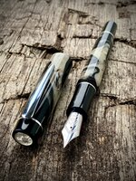 I made myself this black oyster pen to fit it to. It's my straight sided model, so no step down from barrel to cap threads, which are m14 triple lead. I went for slightly larger threads to allow me to shape the section a little more than I would be able to with a 13mm equivalent. The diameter of the no8 nib housing is around 10mm so it gets a little tight in there.