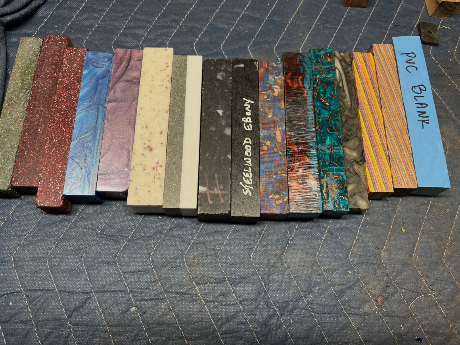3 Glitter/Resin blanks, 3 Corian, 3 Spectraply/Diamondwood, 6 acrylic and resin hybrids, 1 blue PVC. Sizes are from .7x.7 to 1inch x 1inch, lengths vary from 4.5 inch to 5.5. Venmo or Paypal with free Priority Mail Shipping. $35