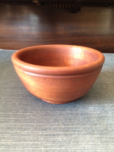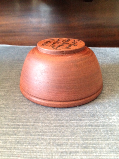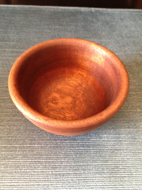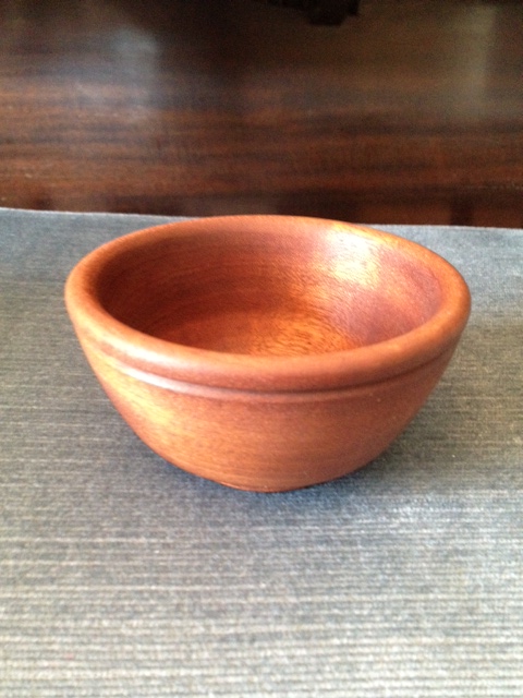 Decided to make a bowl last night, 1st attempt and I'm pleased, very light weight, approx. 2" high x 4" diameter. Fortunately the wood was bone dry all the way through so I was able to complete it all in one session. Sanded to 600 with walnut oil and mineral oil finish. Looks almost unfinished in pics but has a nice sheen in person. Wood is unknown to me, I think Padauk but not 100%. This makes me want a set of Cole jaws or something to help clean up the foot a bit. C&C welcome and thanks for looking!