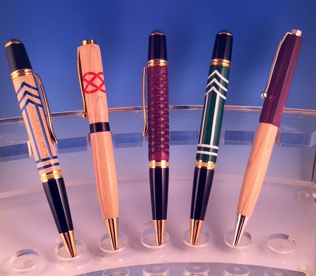 Gisi style pens and Celtic knot are carved and filled with polymer clay. Cross hatch and faceted cap are just carved and finished.