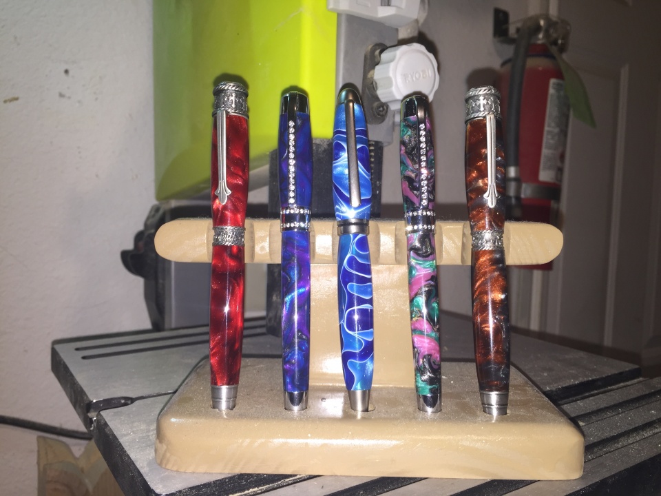 Red pen is for my wife to use as her church pen, purple and blue (amethyst was the blank name) is a bday gift for my pastors wife, water blank and euro pen is my daily, colorful pen (abalone was the blank name) is a bday gift for my sister in law and the last is a blank I made with the FHL kit for my church pen.