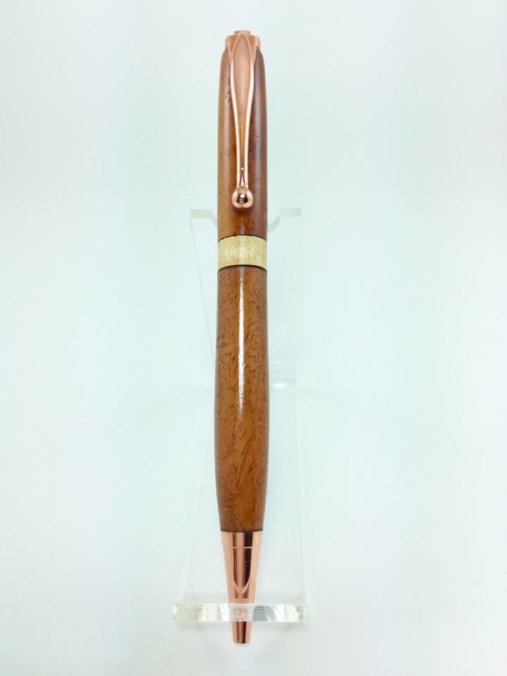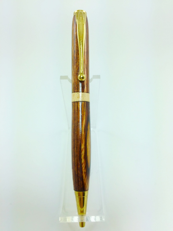 The first is a Rose Gold Slimline on Hawaii Tychee, the second is a Titanium Nitride and I'm not sure what the wood is. I chose to make custom center bands out of Maple for both pens which I think adds character and distinction to them.