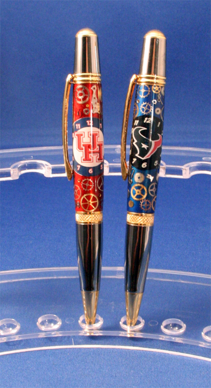 These 2 pens are a birthday gift for a cousin of mine who is a UH alum and a huge Texans fan. The watch parts blanks were made by Mike Hirsch (Indiana_Parrothead) especially for this gift. The kits are Black Ti & Gold Ambassadors from Exotic Blanks - the cross-hatched gold band really goes good with the watch parts.