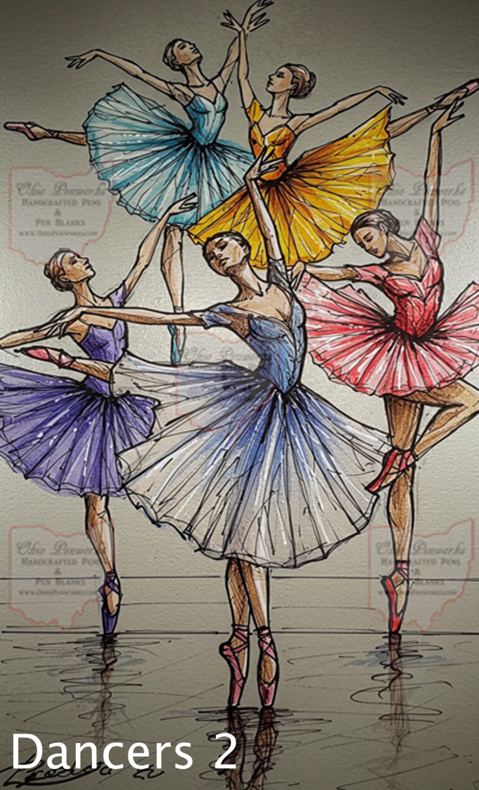 Add a touch of elegance to your next project with this Alumilite Acrylic Pen Blank showcasing graceful dancers in vibrant costumes on a sleek gradient gray backdrop. Each piece is meticulously crafted to order, ensuring a unique and stunning result every time. Elevate your creations with this