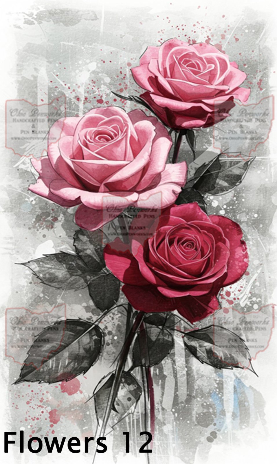 Add a touch of elegance to your handmade pens with this stunning Alumilite Acrylic Pen Blank. The design showcases a striking picture of a red rose and two pink roses set against a unique and modern abstract gray background. Perfect for pen turning enthusiasts looking to create one-of-a-kind pieces.
