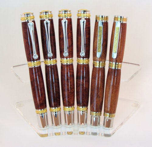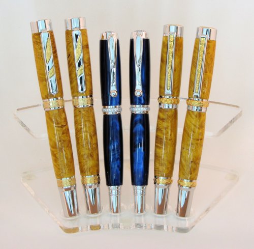 Two Imperials with gold-dyed box elder burl, two Venus' with Madrepearlato Blue Italian acrylic, two Roman Harvest with gold-dyed box elder burl