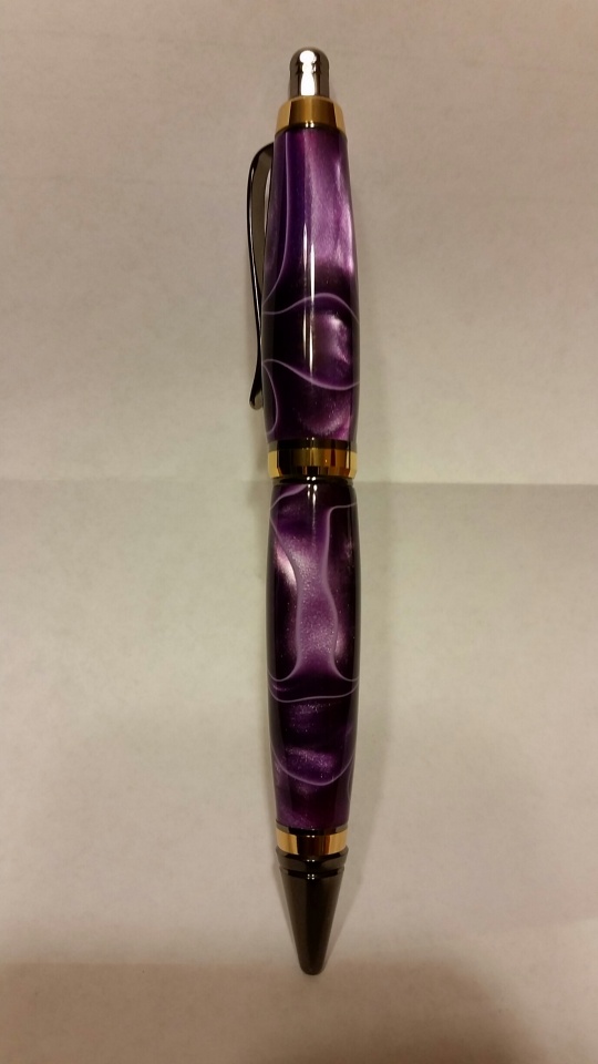 This was the 2nd pen I turned and the 1st Acrylic. My wife likes purple so it was made for her and she also wanted it to be a push button pen. This was the first time I was able to get it away from her for some pics. I think it came out really nice other then the push button does not always work (going to call the company where I got it from to see what they say).