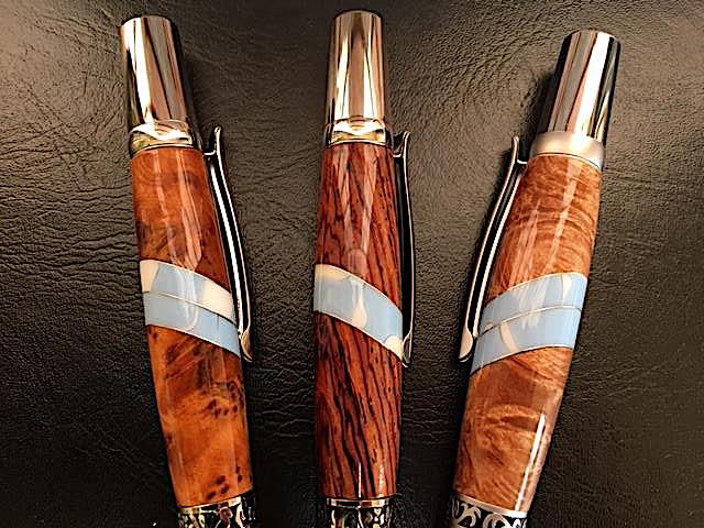 Needed to fill an order with "NC Blue" so I turned these 3 Wall St II pens and segmented acrylic with Amboyna Burl, Cocobolo and Maple Burl. Not sure which one I like the best but they were fun to turn as always! RossVH