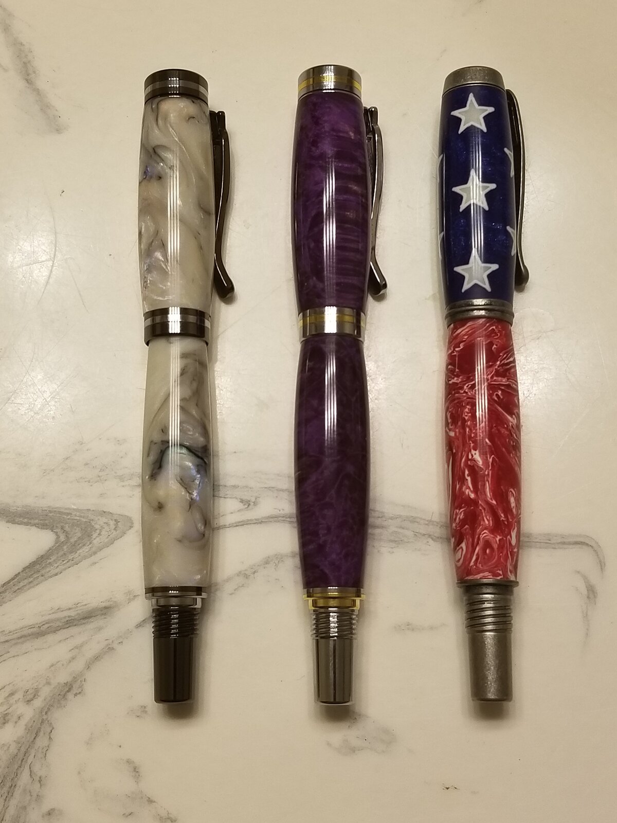 2 kojents (faux abalone and dyed box elder) and a jr. Something with a better centered star blank and a darker red swirl.