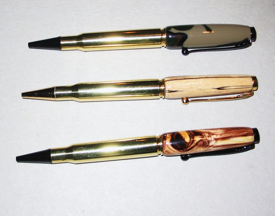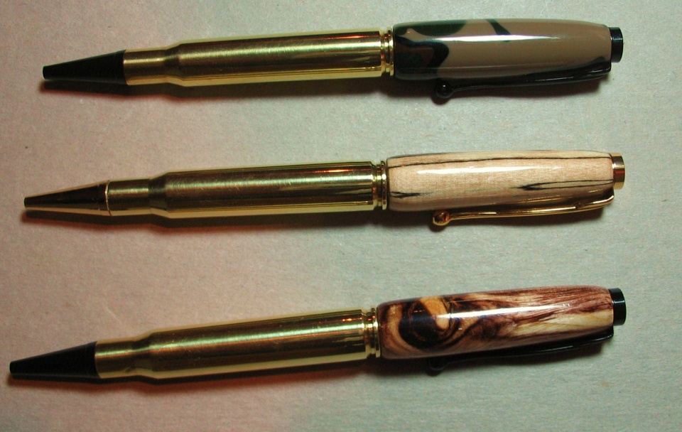 Hunting season is just around the corner. I love the 30.06 cartridge pens. I actually like them better than the bolt action pens that have become so popular. Middle pen is spalted maple and the one on the bottom is from a piece of wood given to me by a friend-----he had no idea what it was, nor do I.