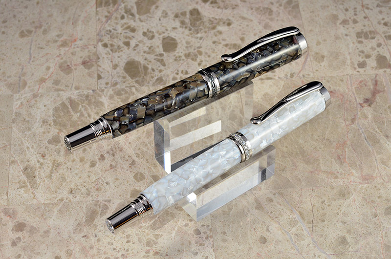 A customer asked me to create a his/hers set for a 30th Anniversary present for her friends. The traditional gift for a 30th Anniversary is pearl. This was my first suggestion...crushed pearl acrylic. I don't even remember when I got this material, but it's a pain to work with as it likes to melt whilst drilling. But the darker color material polishes to a simply stunning finish. The white isn't bad either. Venus and Statesman Jr. Rollerball kits in Rhodium plating, from CSUSA. I like the result. My customer seemed very pleased.