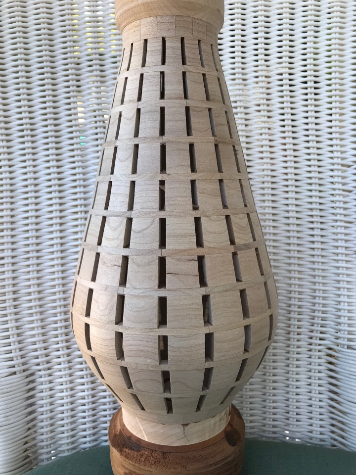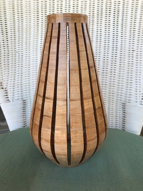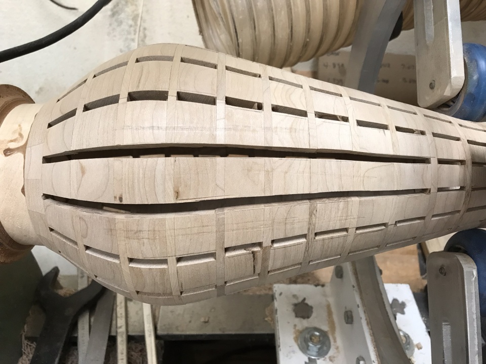 Started with the cutting segments 18 per round, 9 for spacers and glue up, then mounted it for turning and cutting out slots.. Wall thickness is 3/32 hand sanding and poly finish.