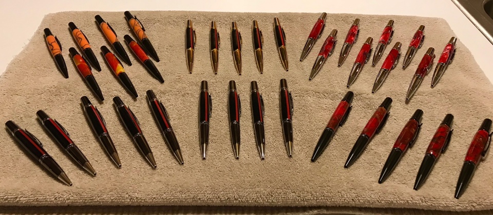 For our local Volunteer Fire Department, who wanted an assortment. (the orange are for the truck committee, who chose Orange & Black for an engine to be delivered next week--our high school colors) Assembled and boxed yesterday, ready for delivery next week. The Thank You hardware from Exotic Blanks was perfect on all 35--the turning was acceptable, but looked better assembled!!