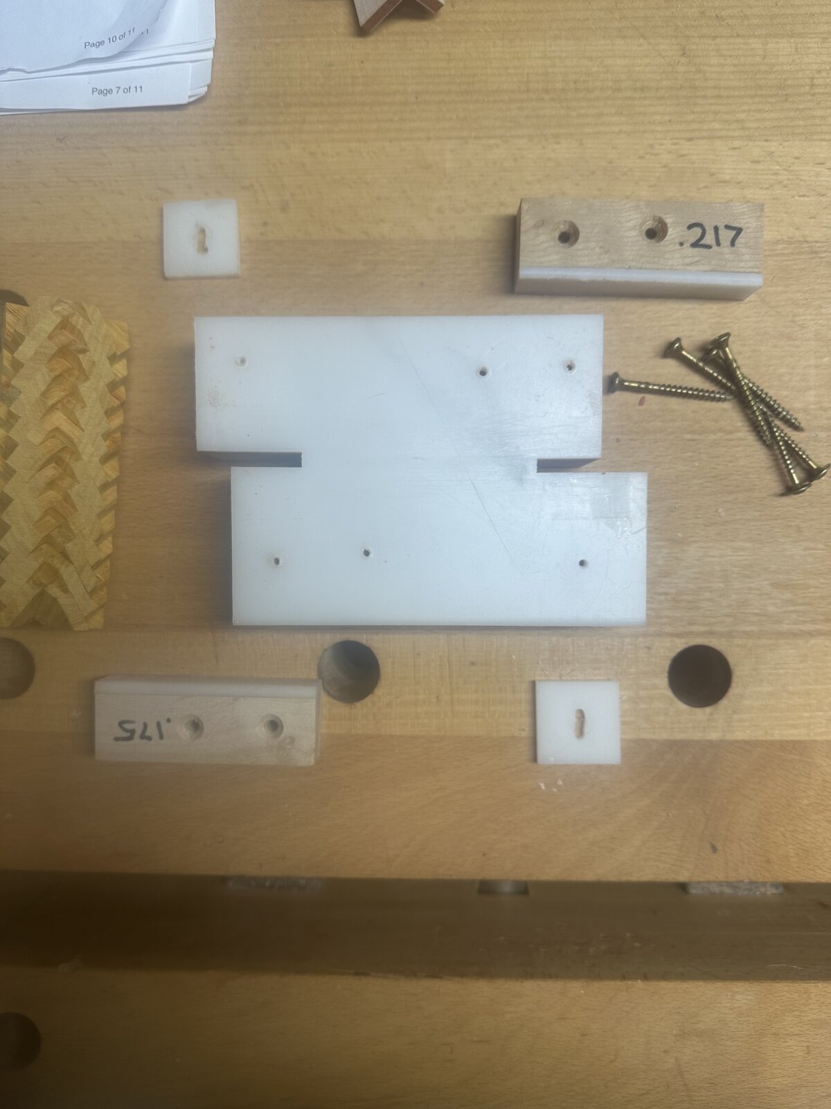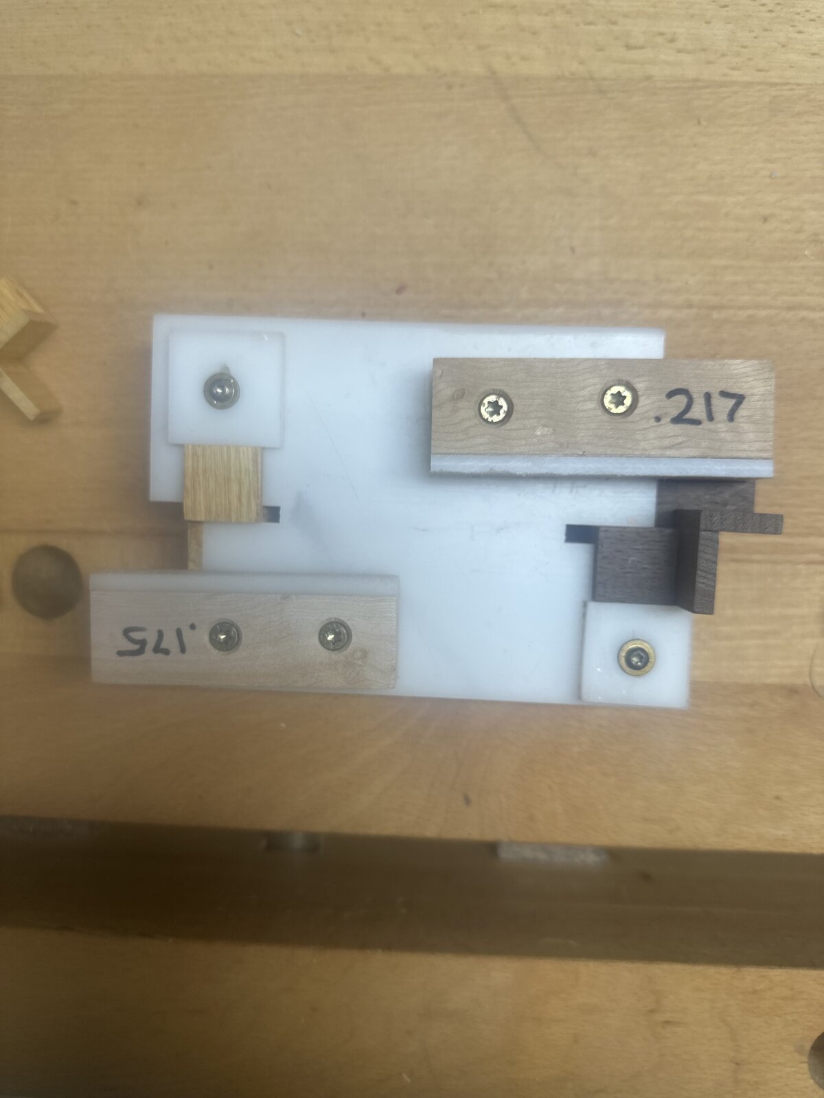 Here's what I came up with help in gluing the left and right herringbone sections together. The glue up's on these require absolute perfection if you want to eliminate gaps. You cannot have any glue residue anywhere. That's why I went with thin CA for the initial glue up's. When I stack the sections, I use Titebond Translucent. The jig has two sections because I thought I needed that figuring out the vaneer. I quickly realized all the squares need to be the same thickness. I only need one end. I drilled a hole part way in the bottom that sits over a workbench dog, makes it easier to hold the parts in there when gluing. I like my vaneer all in 1 side as it's easy to spot mistakes. I would have thought there was only one way to orient the veneered squares. Turns out there are at least 2 that work.