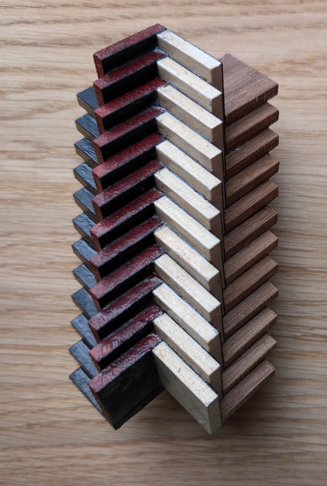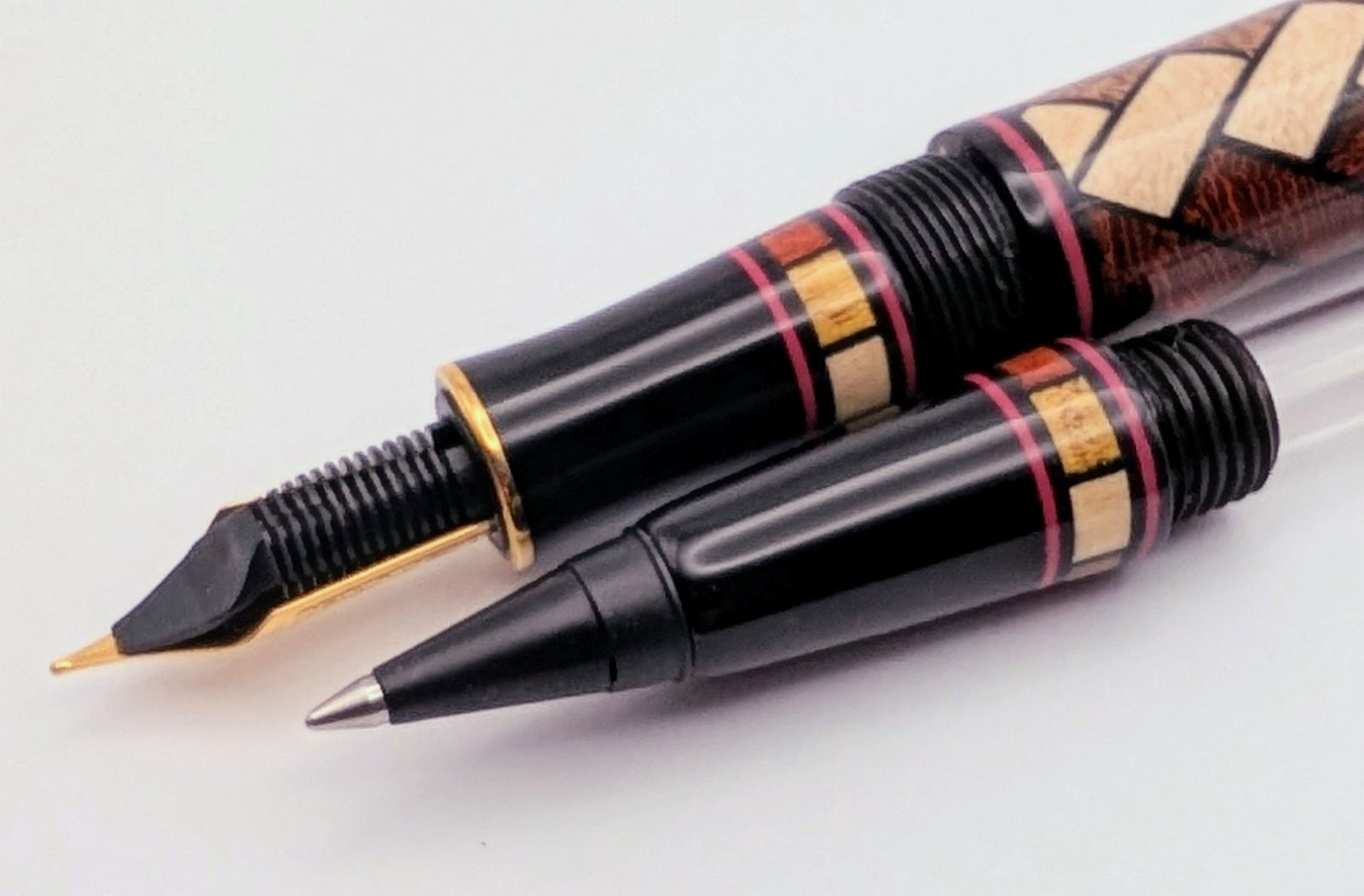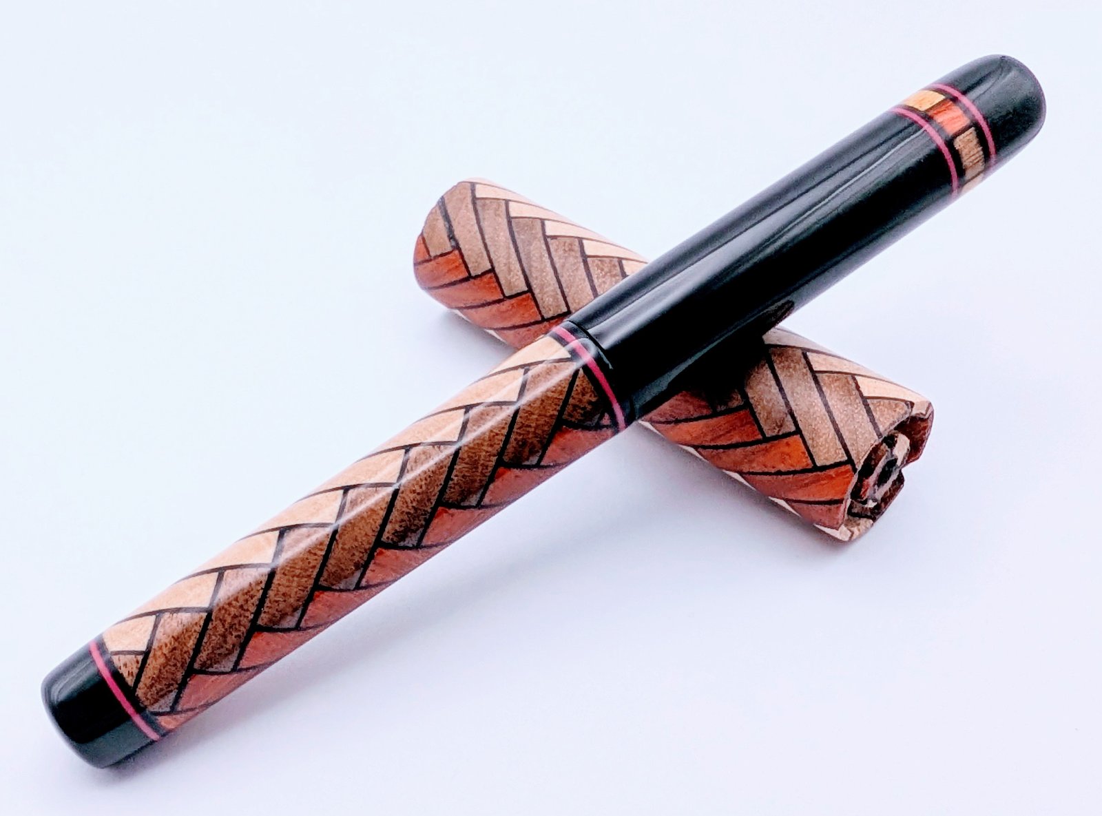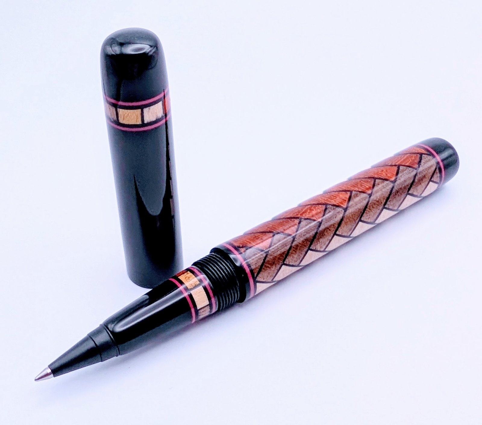 Walnut, Padauk and Holly, black tulip veneer, black and red pvc accents and black acrylic. I made an option of fountain or refillable roller section.