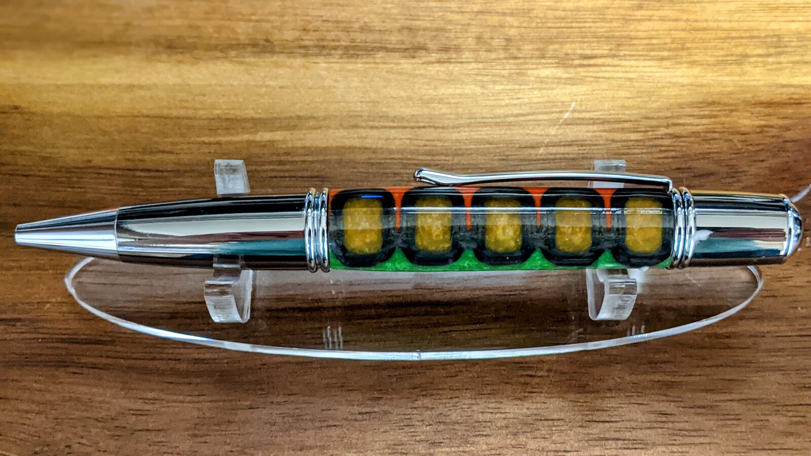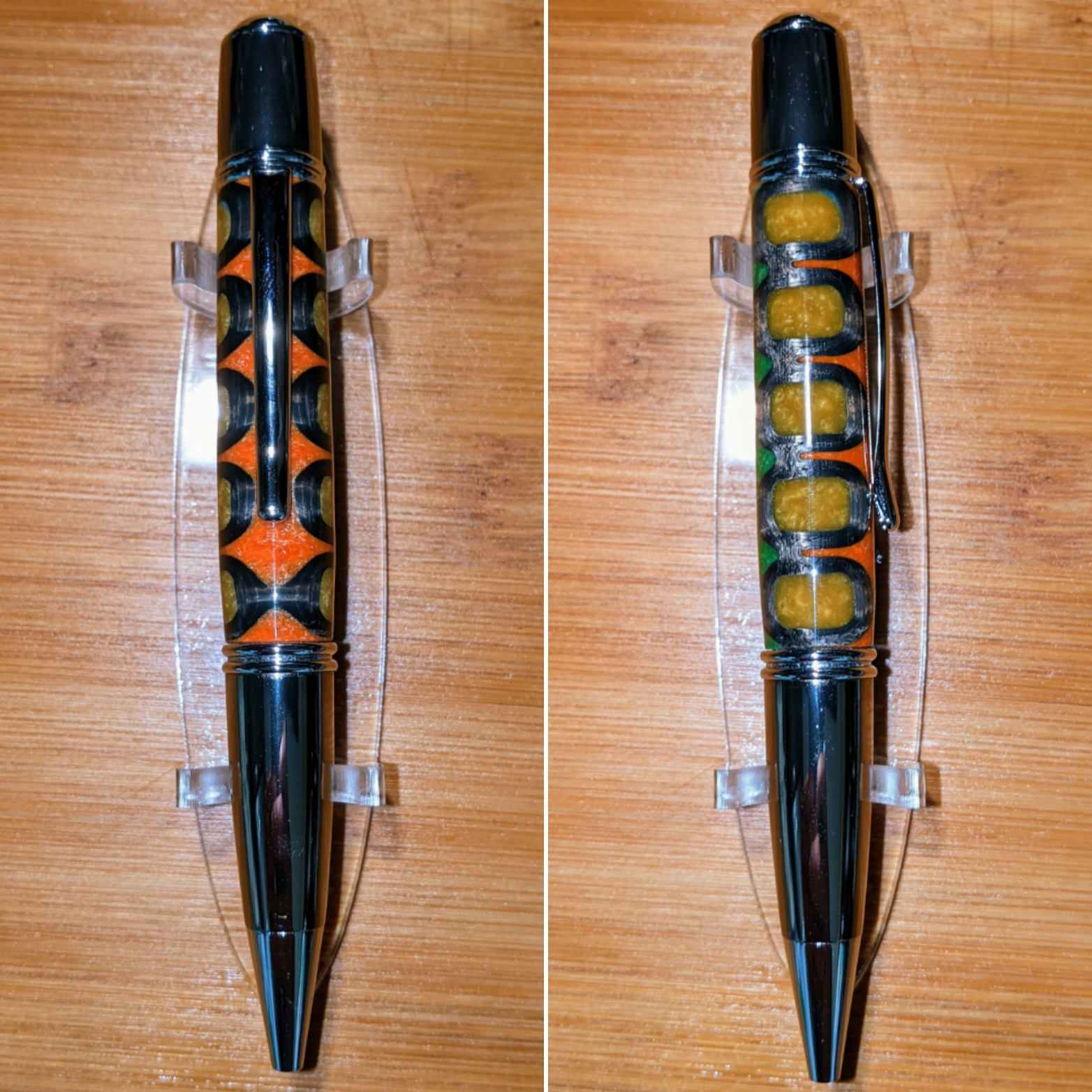 I was going for an MCM inspired pattern with funky colors. The mold and outline of the pattern are Black Silk PLA printed on my Ender 3 Max. The PLA actually finishes fairly well on it's own, but ain't 6a couple of coats of CA definitely makes it pop.