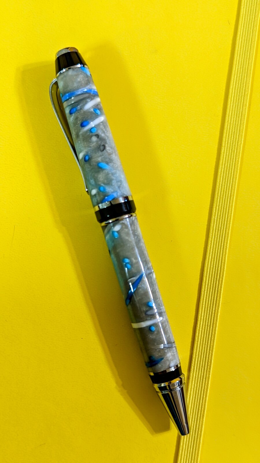 I had the bright idea of casting some 3D printer filament samples, twisted into coils, in resin. There was really no way to control where the filament wound up on the blank. Some sections made stripes, while others show as just dots. While I like the effect of the randomness, I don't think this is an idea that I'll repeat.