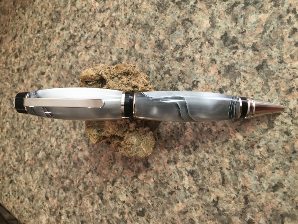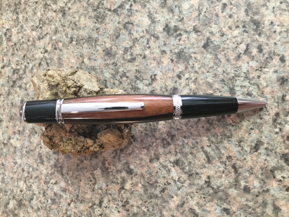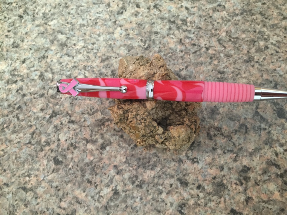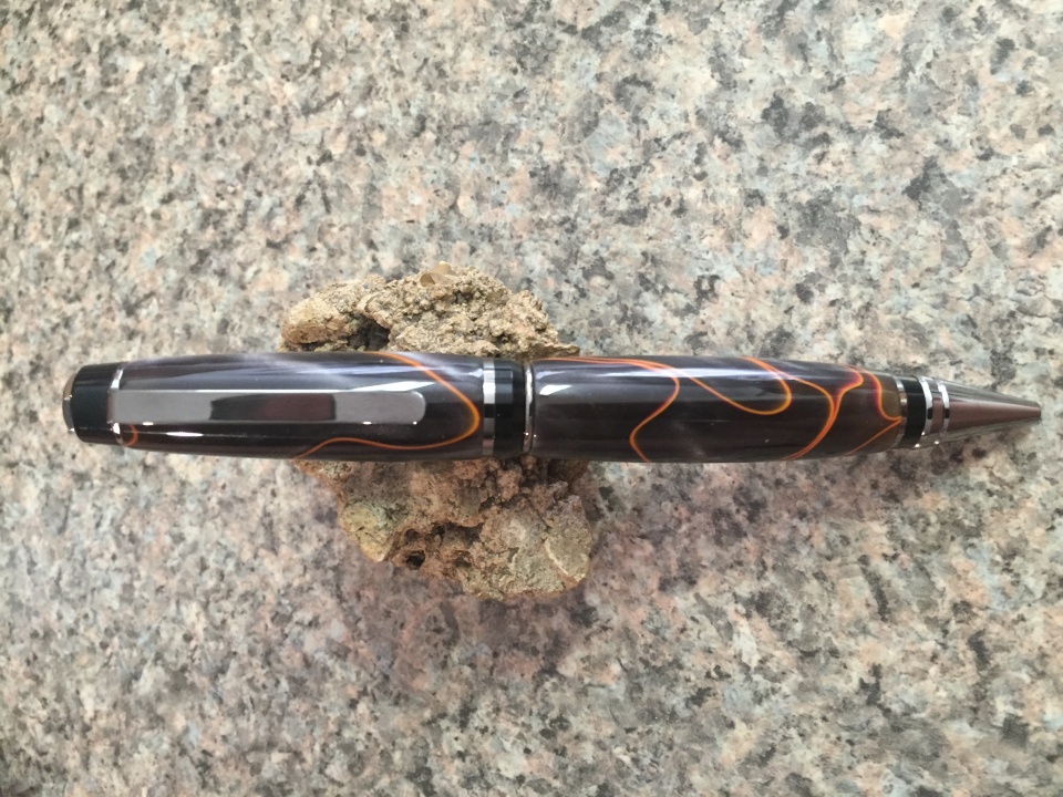 My Brother came to visit and wanted some pens. We ran down to the local wood witch craft store so he could pic his sets. Lava acrylic blank with black TI kit for a cigar pen, platinum acrylic blank with platinum kit for a second cigar pen, ebony blank with chrome kit for a Wall Street 3 kit and flamingo acrylic blank with chrome and soft grip support cancer kit for his wife. These are my first ever acrylic blanks to turn, and man I love the way they look. Micro mesh is awesome!