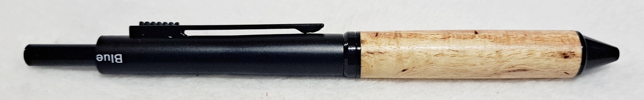 This is a new kit from Woodturningz. It's a 4-Way Tech Pen in satin black. 4-Way because it has blue, black, and red refills, and a 0.7mm pencil. Kind of cool. You hold it horizontal and rotate the entire pen until the ink or pencil you want is up, then depress the plunger. Push up on the clip to retract it. The wood is locust tree burl. The finish is Pens Plus.