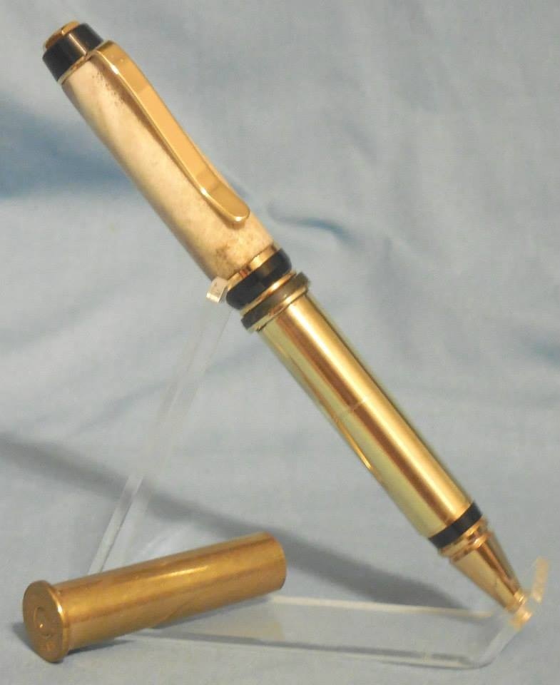 45-70 brass cartridge as lower barrel. A piece of pick guard serves as spacer to complete the length needed. Deer antler upper barrel.