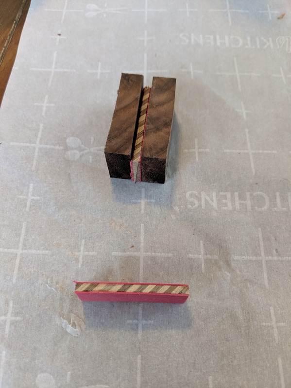 My block was large enough that after cutting a strip of inlay, the strip was long enough to cut in half and be used for a single body pen. I went ahead and glued by color veneer on both sides of the inlay strip before cutting. The thickness of the inlay doesn't matter here since we aren't trying to do a chevron match, but I wouldn't make it thicker than 1/8".