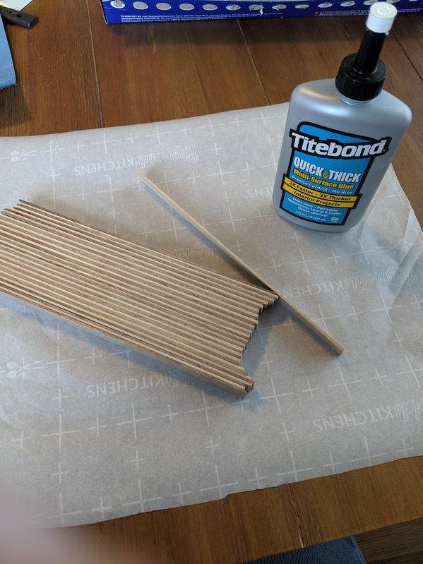 To start, I used 1/16x1x12" strips, 15 each, of Walnut and Maple. I had a good friend at work who has a nice thickness sander to help with this. You can also buy 1/16" stock and cut strips yourself as another option, which was my backup plan. I created a block to cut inlay from by alternating strips of walnut and maple, using Titebond Quick and Thick since it dries clear. I also tried my best to stagger the strips at a 45-degree angle to reduce waste. I took my finished block to the bandsaw and sander to touch it up, and I was ready to cut some inlay!