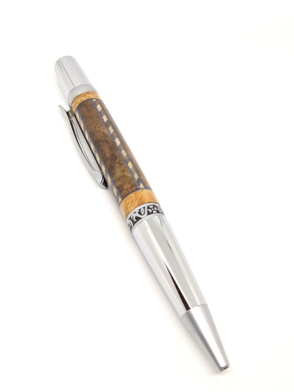 My thought was instead of trying to get perfectly matched chevrons on my first try, how about getting halfway there? My goal was to make a blank with 45-degree alternating Maple and Walnut inlay separated 90 degrees apart. The blanks below were made from Black walnut crotch for the main body, maple and walnut strips for the inlay, color veneer, and Maple burl for the end caps.