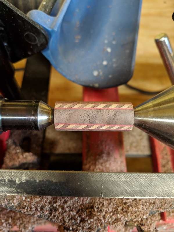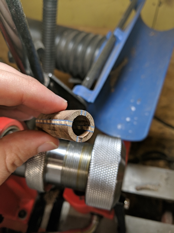 Once the blank was round, I used my collet chuck system to drill on the lathe for my tube. After that, I did the glue up with 15-min epoxy also adding the veneer and end caps. Once cured, I turned and finished as normal.
