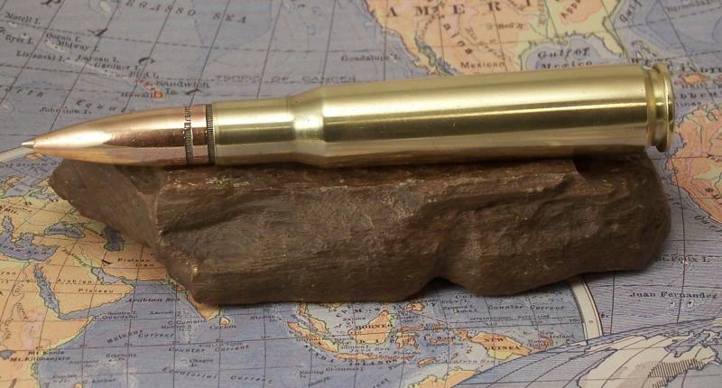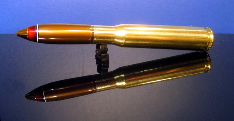 This 50 Cal Pen is for my little brother for Christmas, He loves Guns and shooting. The kit is from PSI, The Bullet part was a freebie from Dawn and Ed and is unknown, (maybe Dawn will tell us) it came with "freebie" written on the side. It looks just like metal after polishing, I added some pick-guard and red Alumilite that I had poured a while back . The tip is under 2" which is the max for the kit but I think it is still to long, I will let him decide and adjust if need be. I like this kit, but I don't like the cross refill.