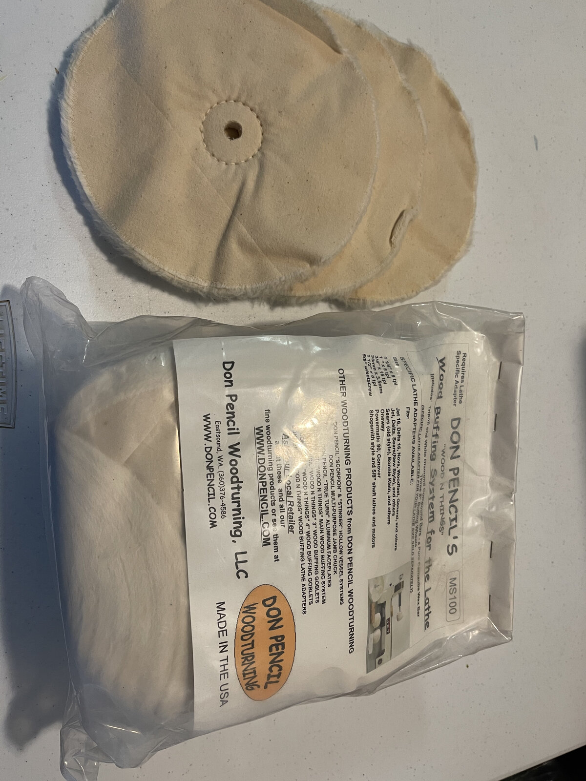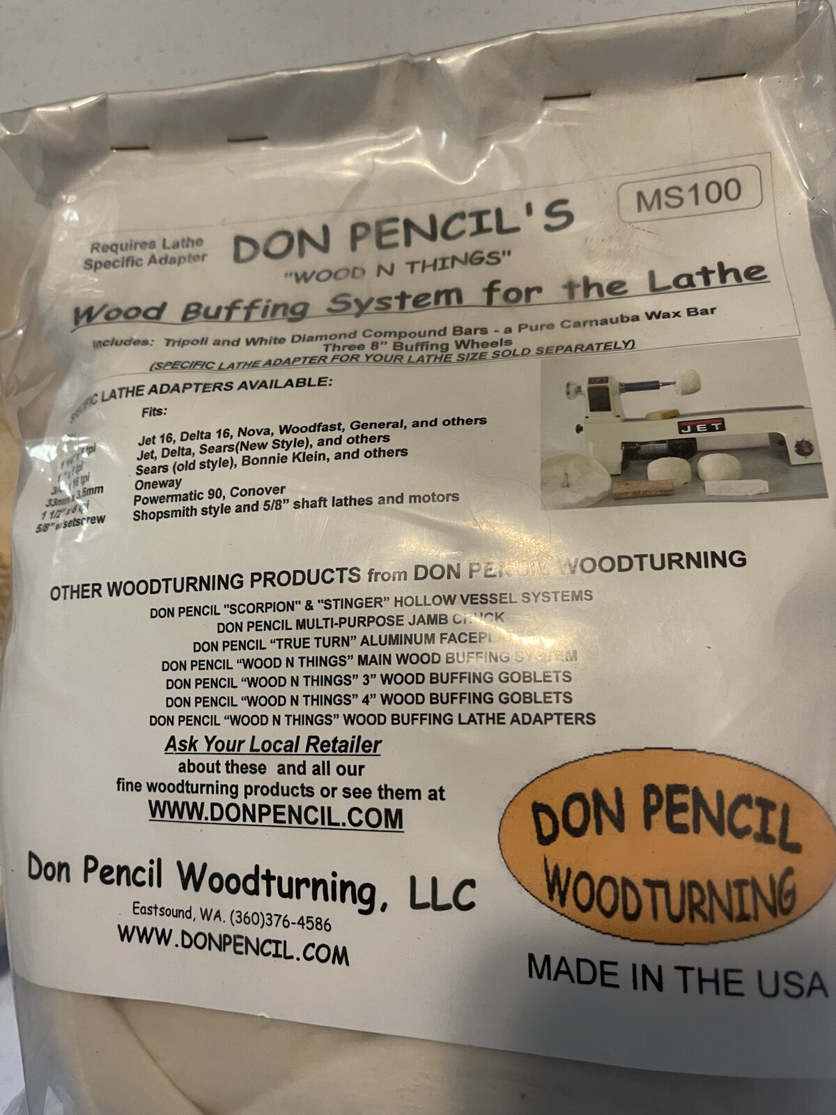 8 inch buffing wheels. 3 loose and 3 in a package from Don Pencil. The Don Pencil package has some product (wax, diamond and tripoli) with it. NO arbors are included-just the bare wheels.