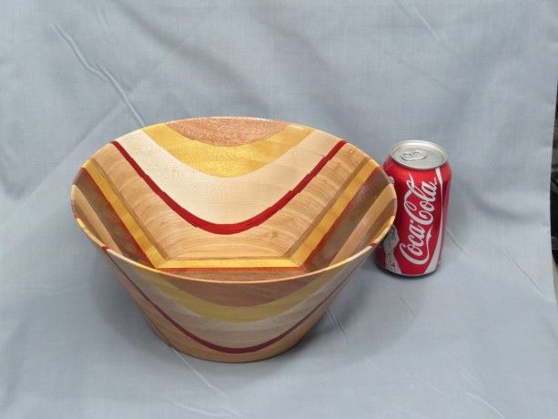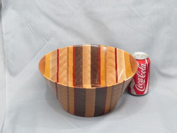 Another one I finished off today. This is a big 11.5" diameter bowl . Too bad it is virtually impossible to get straight lines matched up perfectly due to the small amount of wood lost as sawdust and shavings when cutting the rings. Wishing now that I had staggered the rings like I normally do with this style of bowl . The Coke can is just for size reference.