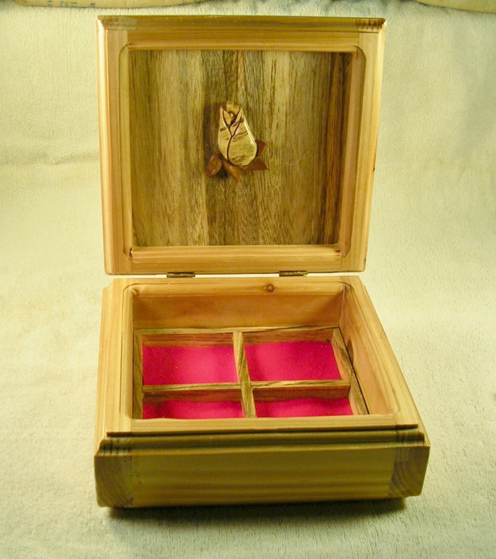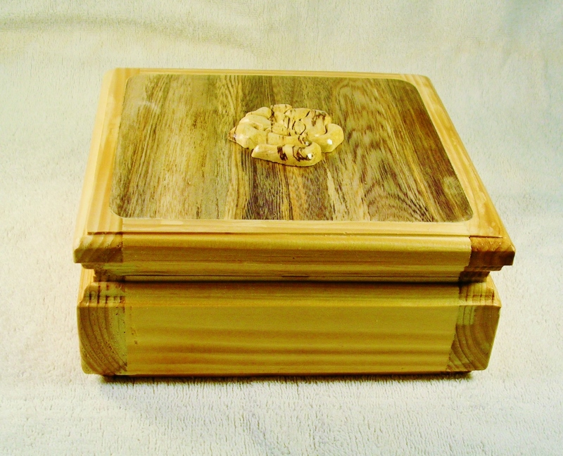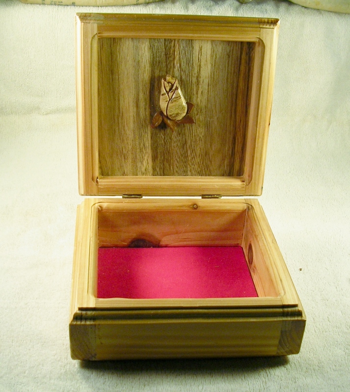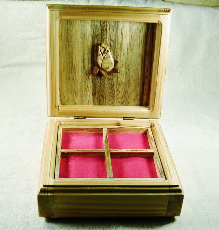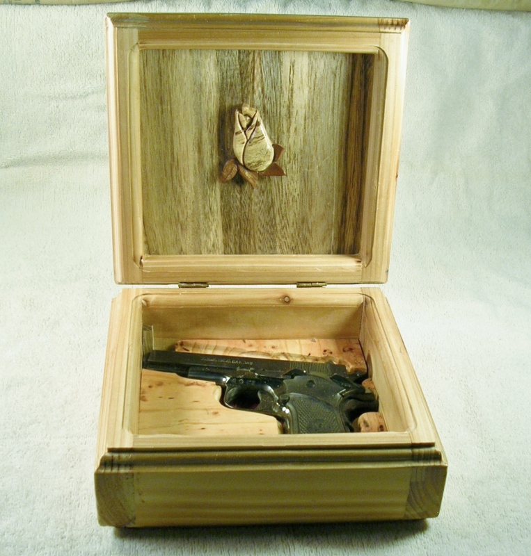 Sorry for the poor photos !! Camera problems that day. Center medallion on top of box is an intarsia rose cut and shaped out of a very white piece of spalted maple. Removable Gun inserts are made out of Bird's Eye Pine or Pitch Pine as it is also called. I finished the case with clear lacquer. Jim S