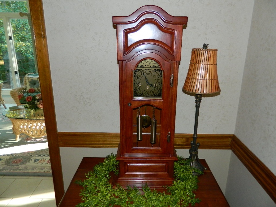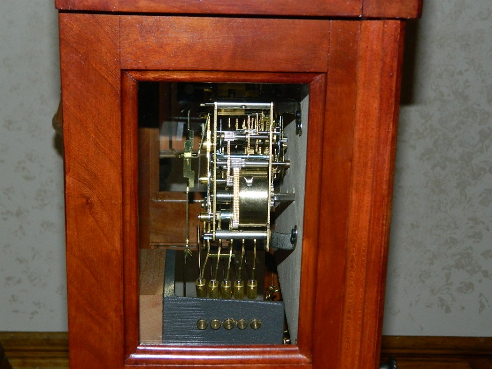 The clock was built from old growth cherry (long story) with plans designed byMark Sommerfeld. I changed the plans to accommodate a mechanical works in place of a quartz movement. All panels were done using Mark's Jr. raised panel cutters.
