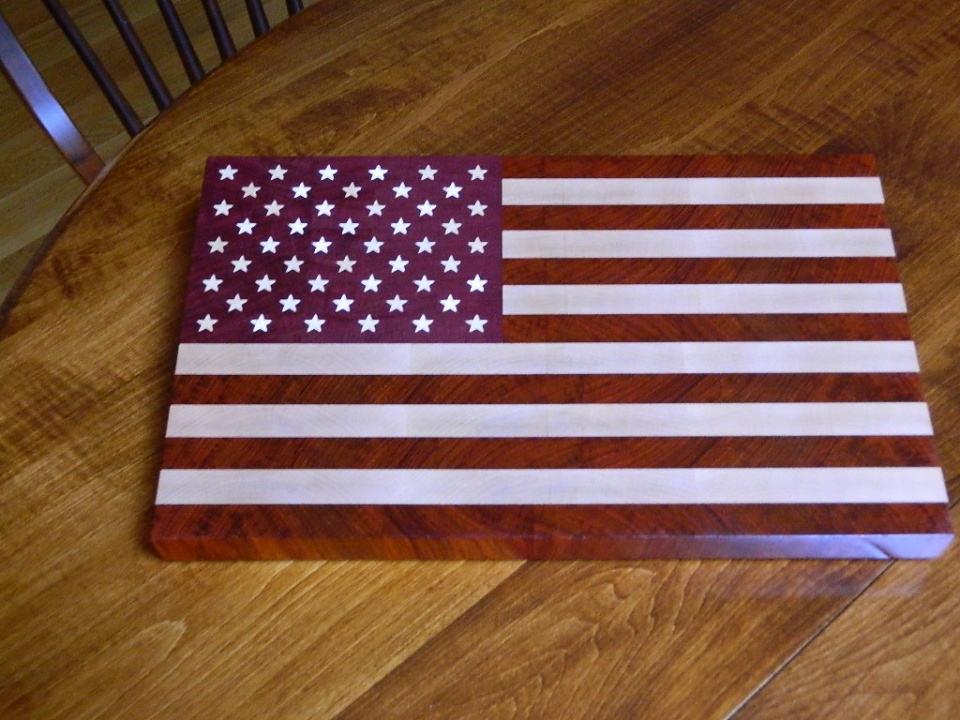 The end grain cutting board was a project I saw on the web. Bruce Robbins,(IAP member) was kind enough to program his CNC machine and cut the stars in the purple heart and they were inlaid with Maple. The board was completed using purple heart, padauk, and maple.