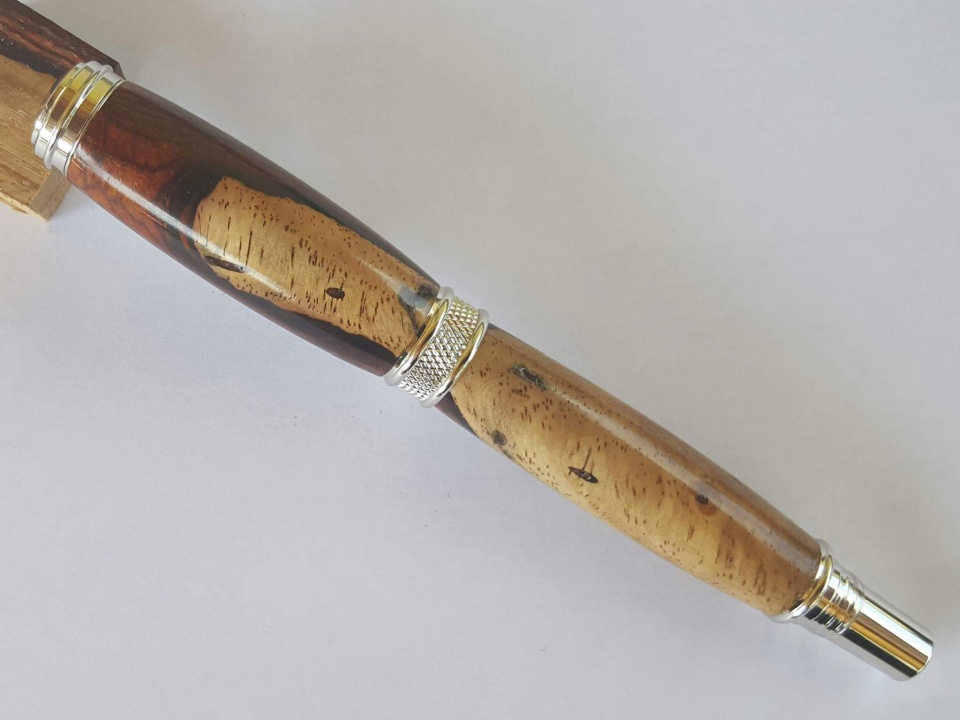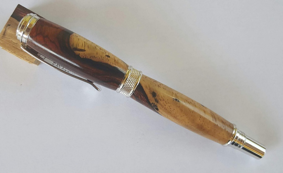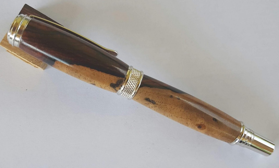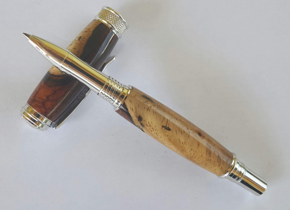 Steve Kondo sent me this beautiful blank. After some searching on Signature Pen Supply it found what I thought was the perfect kit, the Chrome Jr. Harold. After a bit of planning I found the best use of the blank to show off the sap and heart wood. I sanded the blank to 12000mm and finished with Wood Turner's Finish. All C & C welcome. Thanks for looking