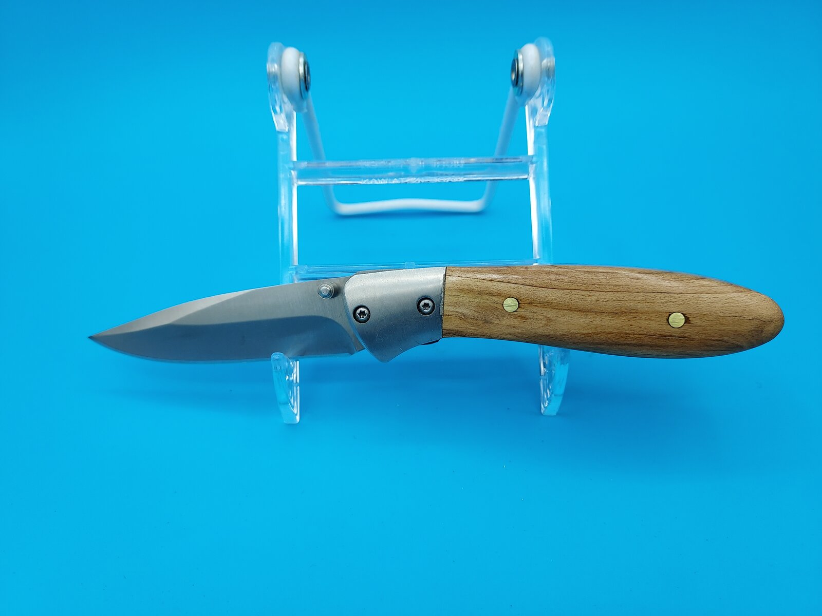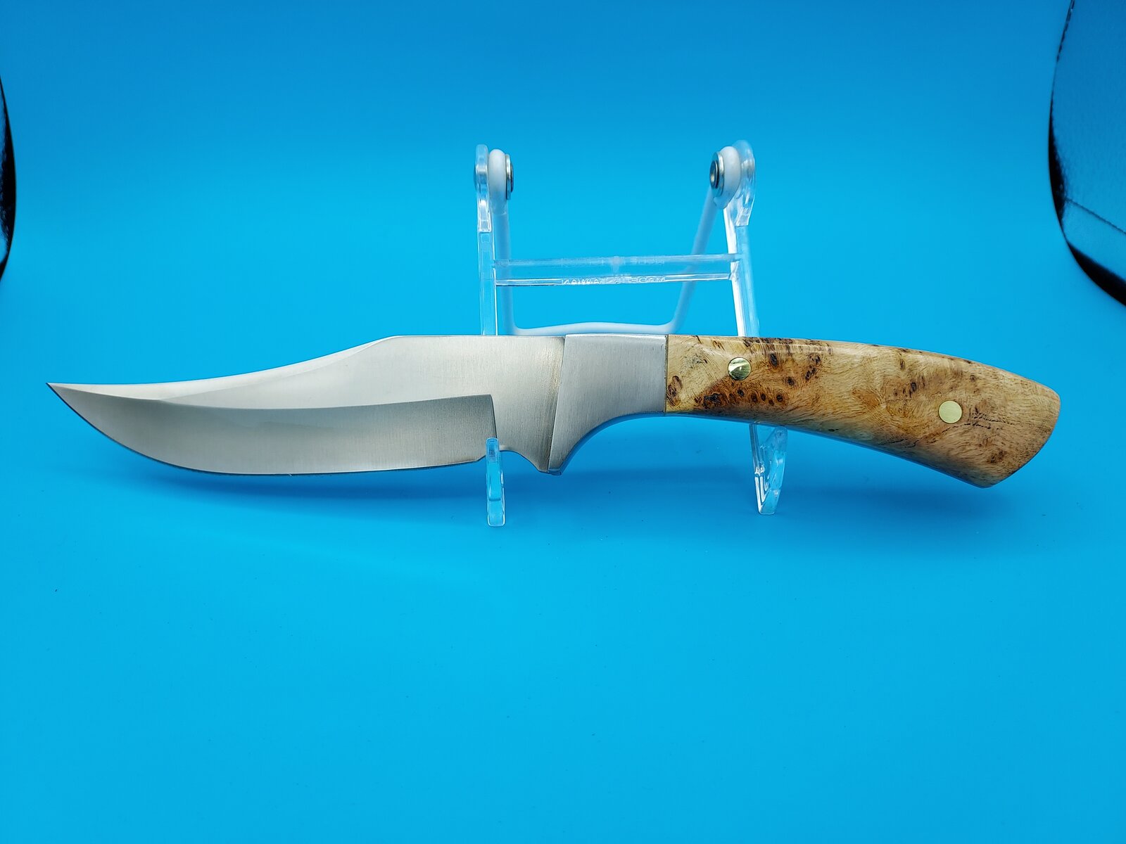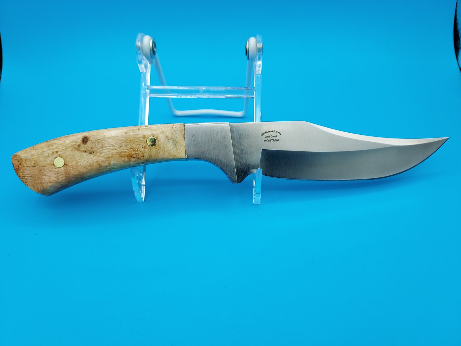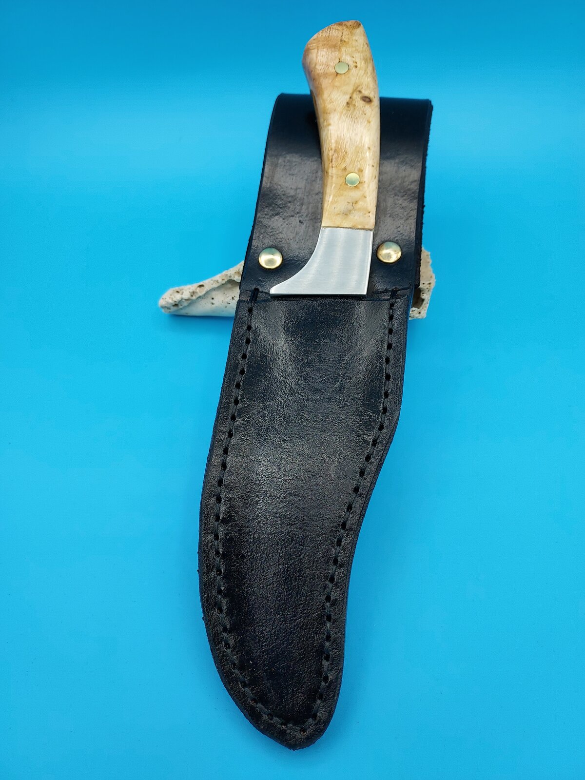These two knives are headed to a Made in Montana store not far from where I live. The Skinner is done in Cherry Burl from Bell Forest Products. The leather sheath is done with veg tanned leather and dyed in USMC Black. The small folder is done in stabilized Rocky Mountain Maple that came off our property at our cabin site. Finish was multiple coats of WOP with a final buffing. Thanks for looking.