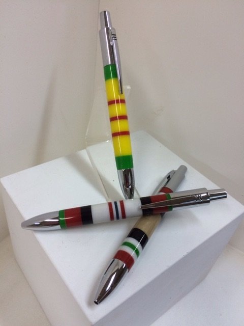 I've shown the middle one before but thought I would take the concept up a notch. A friend (Matt Pashby) did the Viet Nam pen in wood for his dad a while back and I did a couple in acrylic (on the CSUSA Manhattan pen) last year.