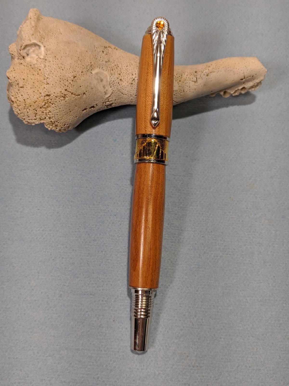 Pen two is a PSI David Broadwell Art Deco Fountain pen. This is for my son. The wood on it is Cherry with a special story behind it that I won't bore you with. I will say that I did struggle with this kit, but not in the turning and assembly. I really wanted this pen to POP in a big way. I tried imitation Ivory, not good. I tried Mango with Bronze built into the blanks, again a no hitter. I tried Brass and Bronze together and it didn't work either. So I just ended up with a special piece of Cherry that I know my son will love. It is a very nice kit I will admit.