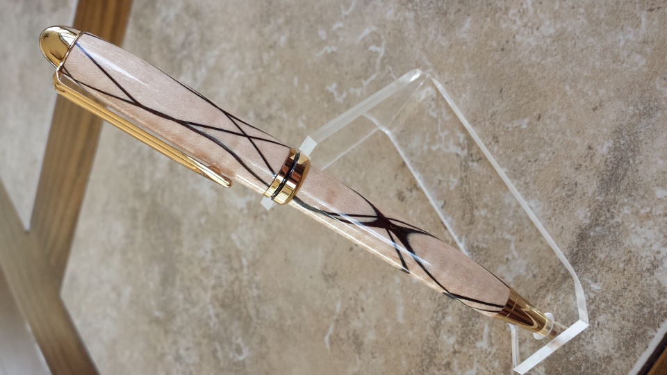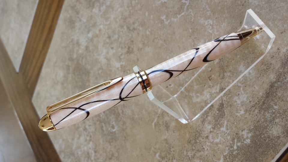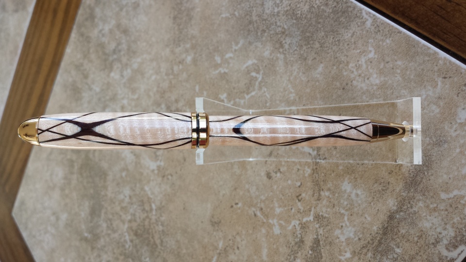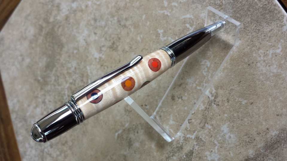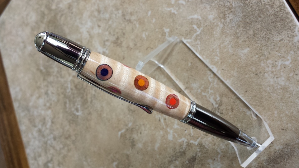 First up is a Chrome and Gunmetal Gatsby dressed in a Curly Maple blank with a few colored pencil pieces glued in. I made this one for the Pen Swap at the FLGAPG this weekend. Second is a Premium Designer dressed in Curly Maple inlaid with East Indian Rosewood veneer.