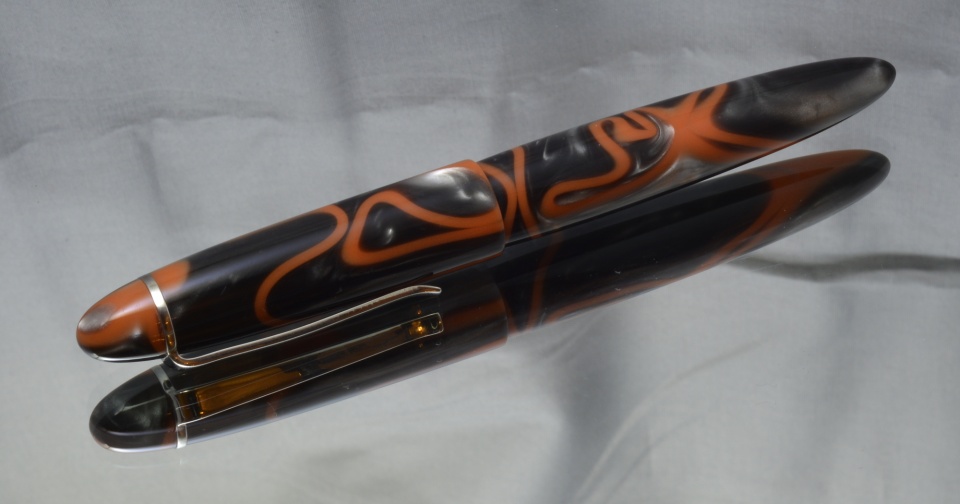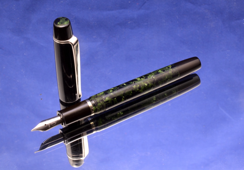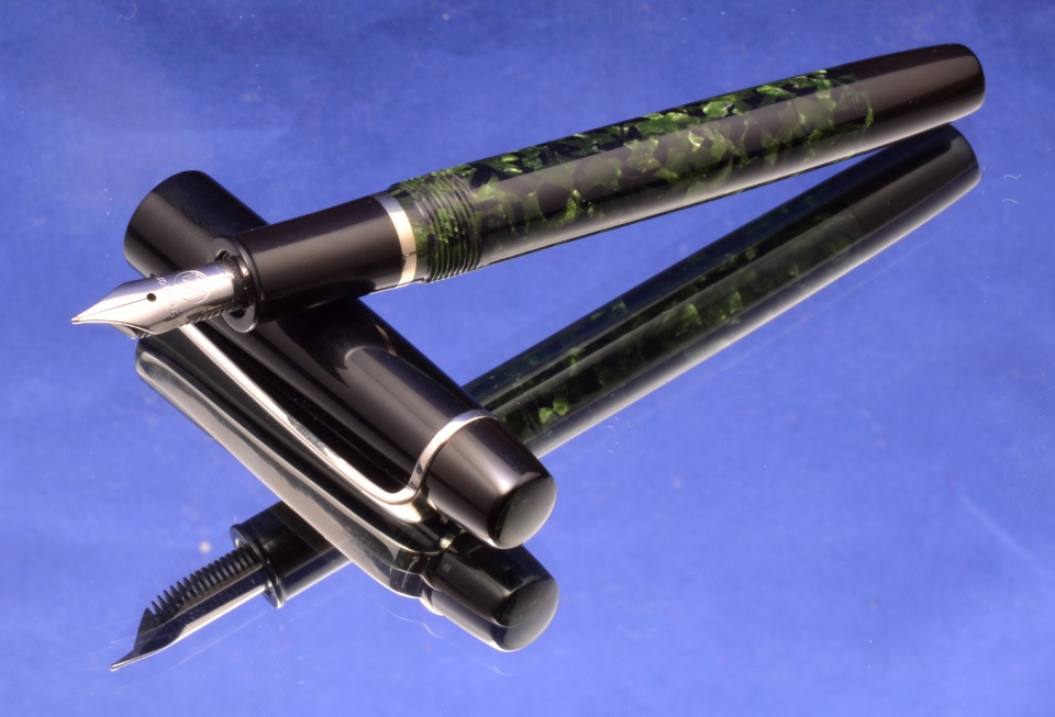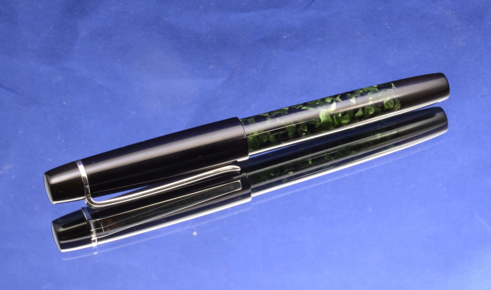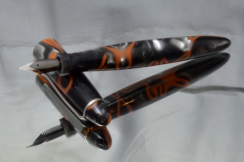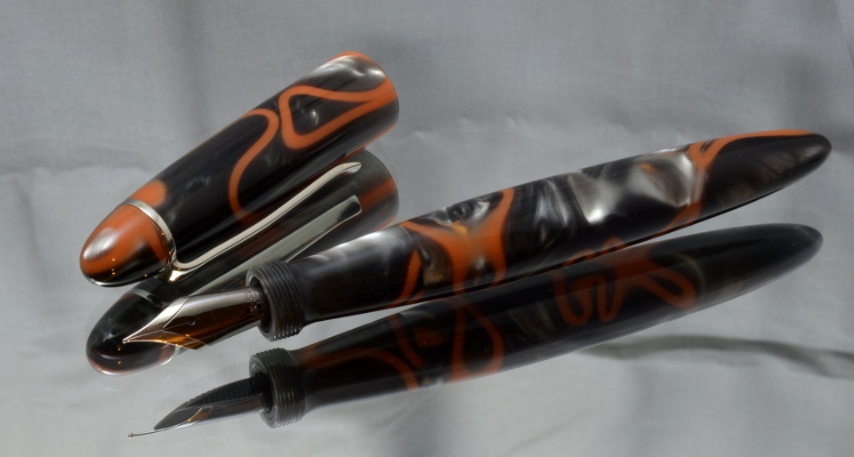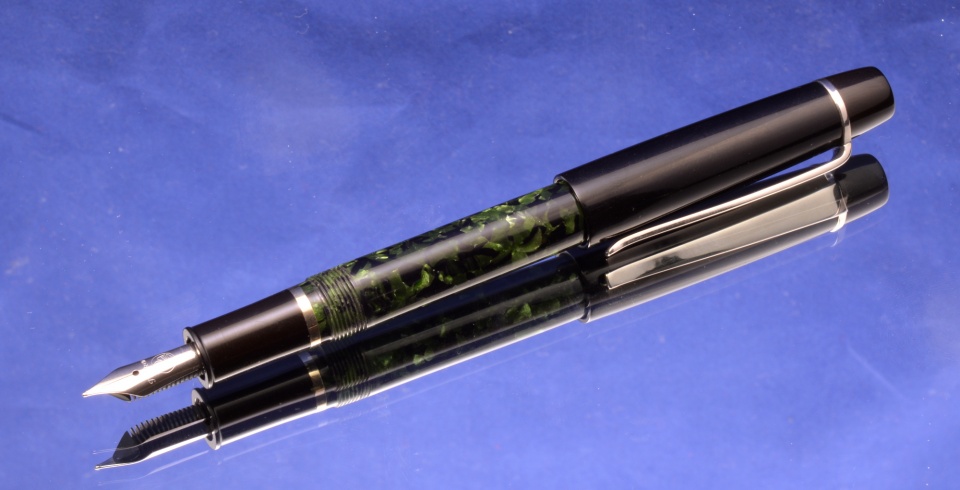 Second is a larger pen made from "onyx" acrylic, and has a #6 14K two tone nib in a ruthenium/rhodium plating. It can be filled using a cartridge, converter, or eyedropper.