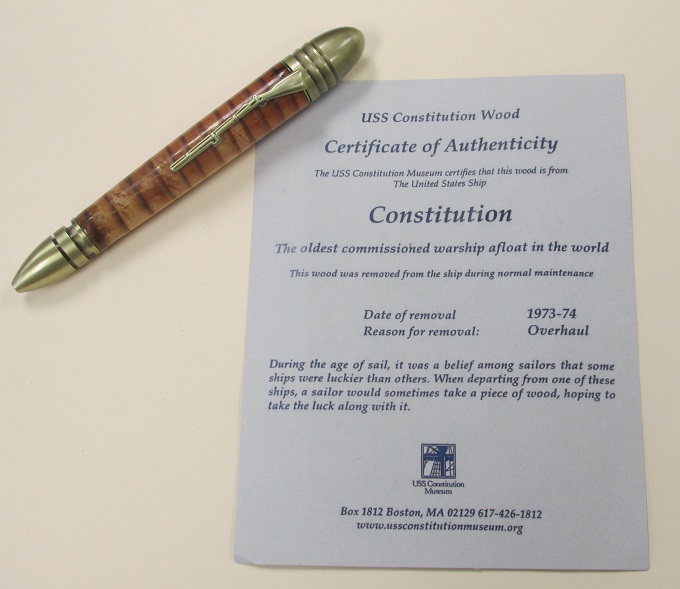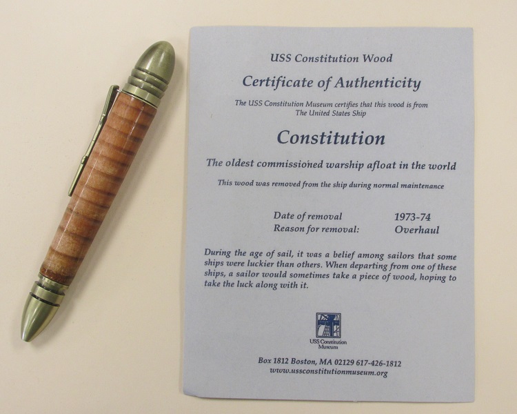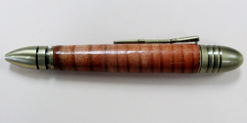 The "civil war" pen gave me some problems. This is made from wood (looks and smells like some type of pine) from the 1973-1974 overhaul of the USS Constitution. While the Constitution did not fight in the civil war it was used as a training vessel. This wood gave me fits to work with. I ended up putting this on a smaller pen because the pieces I had kept breaking. As well, the light part of the wood was rather tender, but the dark age lines are very hard. This pen is not perfectly round. Any time I put a tool to it to turn it round it started to breakup, so I did the best that I could. Actually I think it looks pretty neat. There are a couple small spots with some pine sap and some stress/crack marks. I still have a couple pieces left, I think I might stabilize them before using them.