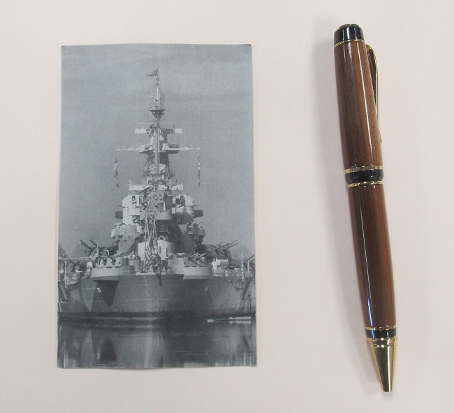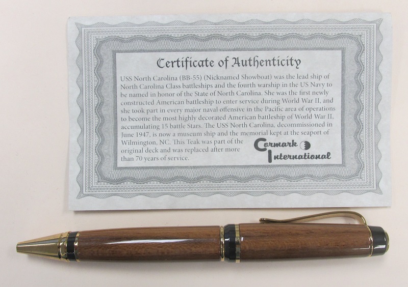 The cigar style pen is made with teak from the deck of the USS North Carolina (BB-55). This wood cuts and sands very nice and smooth.