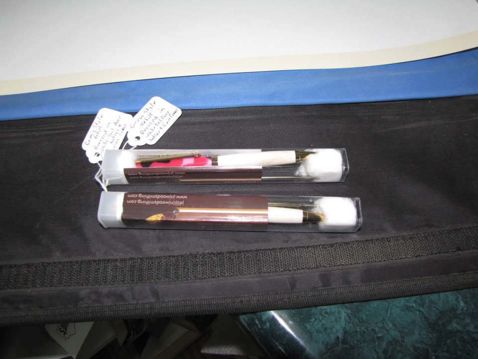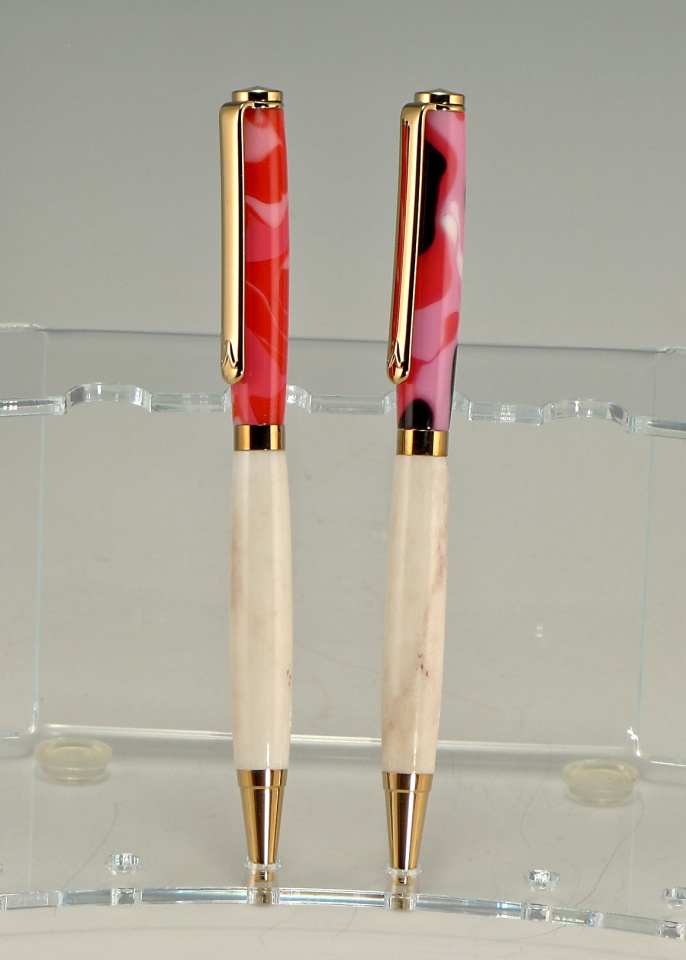 My knife customer(see "Beauty" and "The Beast") wanted a pen for the female members of the family that got the knives, made from the same set of antlers as the knife handles. These are my versions of a more feminine camo/antler pen. Both are CSUSA Gold-Titanium slimlines. The antler has 8-10 coats of CA then MM to 12000 with a finale coat of Renwax on both the antler and the camo.