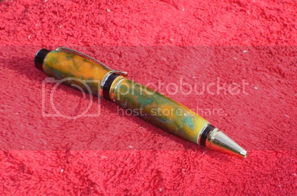 I got the blanks Saturday, and commenced turning a couple of them Unfortunately the blue and orange one ran into something very hard and a big piece was chipped out of the upper end. To make the long story short, I decided to finish the pen, albeit about 3/8" shorter than what was called for.