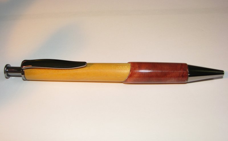 A Black Titanium Clicker. I call this my "Ketchup & Mustard" pen. It was a [strike]pain to make[/strike] real learning experience!:biggrin: The Osage Orange barrel is satin sheen; and the grip, which is made out of an unknown burl, is high gloss. Both sections were finished with CA.