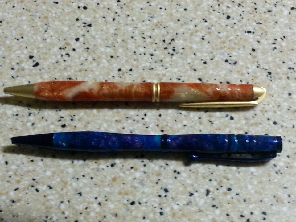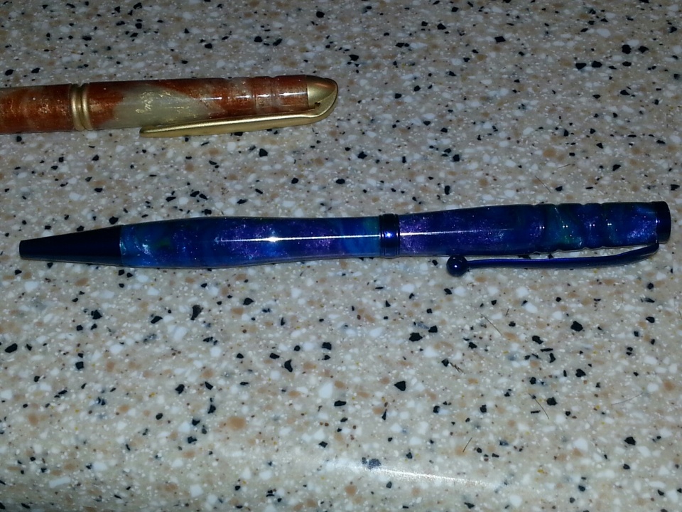 This is a couple of new ones I did tonight. The blue is a store bought blank. The bronze and gold is my first attempt at my own resin pour. I still need some practice on pouring resin. Hope you enjoy. All C&C welcome.
