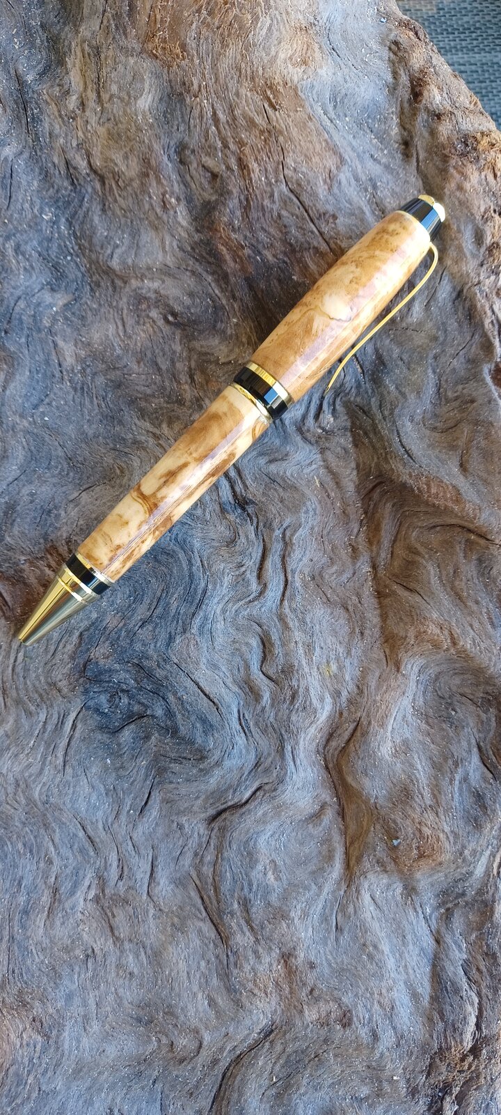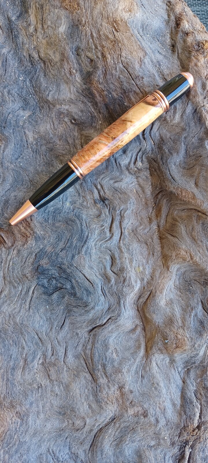 An Athel Tamarisk pen-pencil slimline set, olive on a Cigar and red oak burl on a copper Gatsby. All with a ca finish. The blank for the slimline was stabilized and cast for me my Kate Harrow. Can't say enough good things about her....