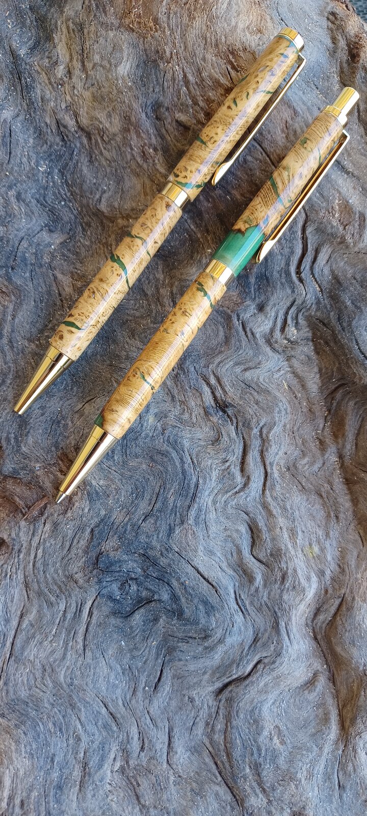 Ray-CA Member Joined Nov 14, 2020 Messages 359 Location San Diego CA, USA (SAN) Jun 9, 2022 #1 An Athel Tamarisk pen-pencil slimline set, olive on a Cigar and red oak burl on a copper Gatsby. All with a ca finish. The blank for the slimline was stabilized and cast for me my Kate Harrow. Can't say enough good things about her....