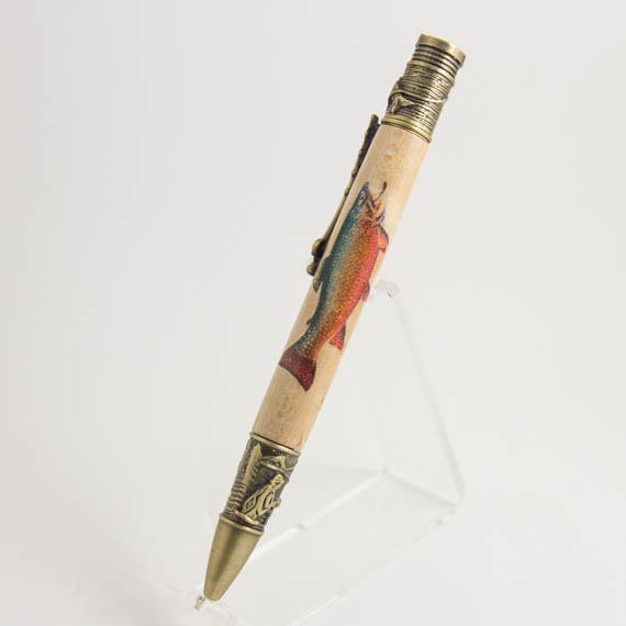 The first is my first decal pen, a brook trout on bird's eye maple and Fly Fishing hardware. GluBoost finish